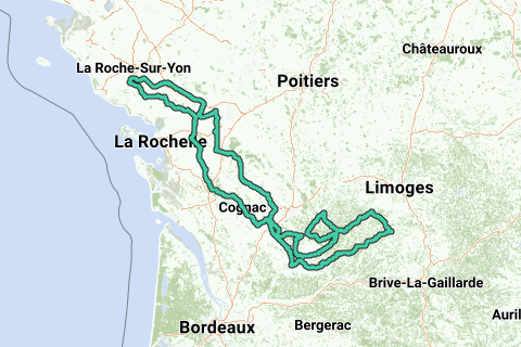 <p><a class="routeYou_embed" href="https://app.routeyou.com/fr-fr/route/view/169905?utm_source=embed&utm_medium=article&utm_campaign=routeshare&navigation=external" title="Route en Charentes / Dordogne et retour Vendée - RouteYou" target="_blank"><img src="https://image.routeyou.com/embed/route/960x670/169905-fr@2x.png" style="width: 100%; height: auto;" alt="Route en Charentes / Dordogne et retour Vendée"></a></p>
