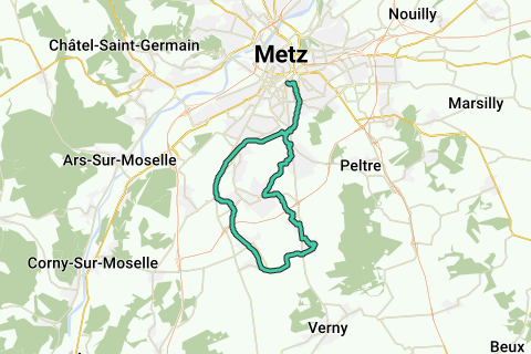 Boucle de la Seille par la nouvelle piste cyclable de l'ancienne voie ferrée Pournoy-la-Chétive - Château-Salins. Départ parvis des droits de l'homme, direction Magny, Marly, Coin-les-Cuvry, Fleury, Poully, Marly, Magny. Retour Place des droits de l'homme, Centre Pompidou.