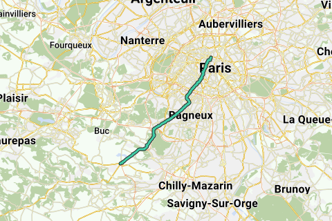 Parcours de transport depuis la maison vers le carrefour du Christ de Saclay; longueur 23 km.