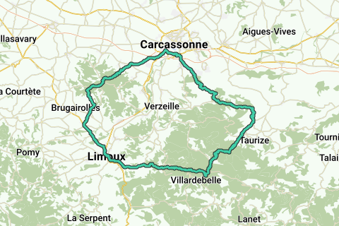 Parcours de 90 km au départ de Montgrenier, passant par le plateau de Lacamp et Limoux.