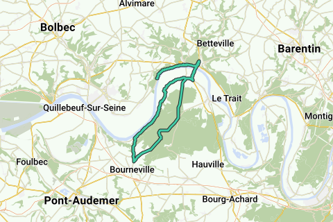 Lillebonne, Villequier, Caudebec, St Nicolas de Bliquetuit, Vatteville-la-Rue, Aisier, vers Bourneville, à gauche D139E, puis D131, à gauche D40 St Nicolas, Caudebec Villequier, Lillebonne (total Lillebonne-Lillebonne 85 km)