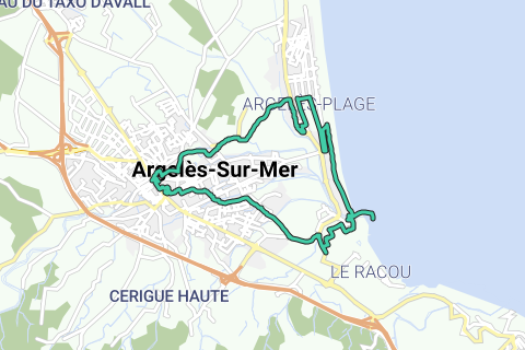 parcour le long de la mer du parking du casino jusqu'au port d'Argeles puis en direction du village (petites rues typiques en centre ville possibilité de "flâner" hors itinéraire) retour vers la plage en suivant la Massane et le ribera de les conques petit circuit dans argeles plage et le bois des pins avant de rejoindre le parking du casino