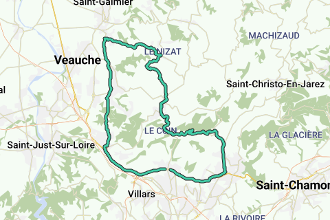 Arrivé à Saint Galmier, passer par Chamboeuf, puis Aveizieux et arrivé sur St Héand. Redescente sur L'Etrat, prendre à gauche au lieu dit Montrond en direction de sorbiers puis arrivé sur la Talaudière. Prendre direction l'Etrat