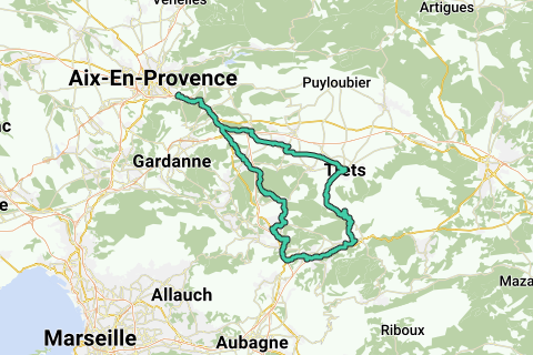 Aix, chemin de la Muscatelle, Piste cyclabe, Trets, St Zacharie, Moulin de Redon, Auriol, La Destrousse, La Bouilladisse, Le Pigeonnier, Belcodene, Fuveau, Palette et Aix en Provence.