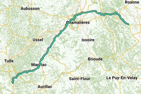 En partant du Forez, les routes traversent l'Auvergne en se faufilant autour des volcans d'Auvergne pour arriver en Dordogne.