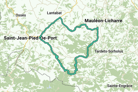Larceveau (0)- ST Jean Le Vieux (12)-col de Burdinkurutxeta (31)-Iraty Cize(33)-CHALETS d'IRATY (39)- AHUSQUY (51)-Aussurucq (64)- Musculdy (75)- col d'OSQUICH (82)- Larceveau (92km)