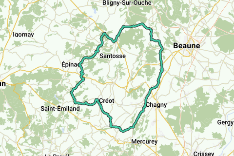 À la découverte à Meursault vous passez de nombreuses routes cyclables amusantes. Profitez seulement! Presque tout l'itinéraire est en pente et vallonné, avec quelques pentes fortes. Il y a peu de chances que vous croisiez beaucoup de voiture le long de cet itinéraire. Faites certainement halte à Criots-bâtard-montrachet. Le long de cet itinéraire se trouve l'hôtel Le Montrachet. Vous pouvez aussi partir là (mais ce n'est pas nécessaire). Descendez une fois et admirez le château le long de cet itinéraire (Château de Monthelie). Cet itinéraire est assez vallonné.