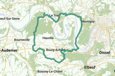 Il y a peu de chances que vous croisiez beaucoup de voiture le long de cet itinéraire. Ici vous roulez à vélo à l'ombre des arbres. Oiseaux qui sifflent, feuilles qui bruissent, humus qui sent ... et vous roulez à vélo et profitez dans le bois (Forêt de Brotonne). Que demander de plus? Cet itinéraire à vélo est faisable pour tout le monde et sera certainement goûté. Les routes jolies se succèdent à fond de train. Cet itinéraire reçoit certainement 10 sur 10!