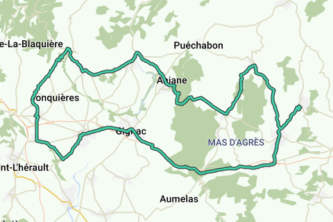 Vailhauquès, Montarnaud, St Paul, La Taillade, Gignac, St André de Sangonis, D4 dir Brignac, D4E4 dir Ceyras, Ceyras, St Félix, St Guiraud, St Saturnin, bas d'Arboras, Montpeyroux, St Jean de Fos, Aniane, La Boissière, Argelliers, Montarnaud, Vailhauquès