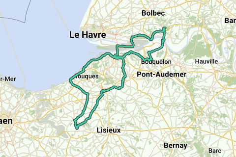 Lillebonne, Le Mesnil, Gravenchon, Port Jérôme, Bac, Quillebeuf, St Aubin, Le Marais Vernier, Foulbec, Conteville, Berville, Fiquefleur, Honfleur, Pennedepie, Villerville, Trouville, Deauville, Blonville, Villers sur Mer, à gauche Avenue Jean Moulin D118 Beaumont en Auge, à droite D58 La Haie Tondue, tout droit D16 Bonnebosq, Auvillars, Léaupartie, à gauche D85 Cambremer, à gauche D101 Montreuil-en-Auge, La Roque-Baignard, à gauche D48 Pont L'Evêque, à droite D675, à droite D579, au rond point à gauche D162, St Julien sur Calonne, à droite D534 Les Authieux sur Calonne, à gauche D140 D140A à gauche D140, passer au dessus de A29, à droite D140A, traverser la D675, Quetteville, D140A, à gauche D283, à droite D104 Manneville la Raoult, D22, Fiquefleur Equainville, à gauche D180, au rond point à gauche D580A, La rivière St Sauveur, à droite Rue du Port, Chemin du Banc, au rond Point tout droit puis à droite vers le Pont, Pont de Normandie, Route de L'Estuaire, Pont du Hode, Tancarville Bas, Radicatel, Chour à Chaux, Lillebonne.