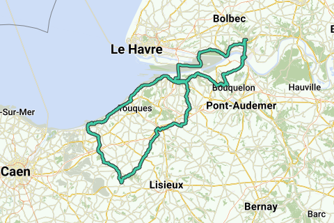 Lillebonne, Le Mesnil, Gravenchon, Port Jérôme, Bac, Quillebeuf, St Aubin, Le Marais Vernier, Foulbec, Conteville, Berville, Fiquefleur, Honfleur, Pennedepie, Villerville, Trouville, Deauville, Blonville, Villers sur Mer, Auberville, à droite D163 Corniche Houlgate, traverser puis D45A vers Dozulé, D45, à droite D142,Dozulé, à droite D675, à gauche D85 Rumesnil, D85 Cambremer, à gauche, à gauche D101, La Roque Baignard, D101 à gauche D48 Pont L'Eveque à droite D675, à droite D579, au rond point à gauche D162, St Julien sur Calonne, à droite D534 Les Authieux sur Calonne, à gauche D140 D140A à gauche D140, passer au dessus de A29, à droite D140A, traverser la D675, Quetteville, D140A, à gauche D283, à droite D104 Manneville la Raoult, D22, Fiquefleur Equainville, à gauche D180, au rond point à gauche D580A, La rivière St Sauveur, à droite Rue du Port, Chemin du Banc, au rond Point tout droit puis à droite vers le Pont, Pont de Normandie, Route de L'Estuaire, Pont du Hode, Tancarville Bas, Radicatel, Chour à Chaux, Lillebonne.