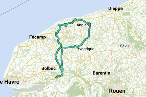 Lillebonne, La Frenaye, Auberville, Grandcamp, Trouville, Fauville, Normanville, à droite D133 Thiouville, à gauche D109, à droite D233 Ancourteville sur Héricourt, Héricourt, à droite D131, à gauche D149, à droite rue du Bercail, à droite rue du Colombier, à gauche Anvéville, Quièvremont, route des Sapinettes, à gauche D110 Doudeville, à droite D149, à gauche D37, à droite rue du Château de Galleville, après le château à droite puis première à gauche, devant la ferme petite route à gauche rue Colmont, Boucourt, route du Vieux puits, Bénesville, à gauche D89, Canville les deux Eglises,D89, D237, D70, Fontaine le Dun, à gauche D142, à droite D89, à gauche D4 Manneville-ès-Plains, à gauche D68, à droite D20 St Valéry, à gauche rue d'Ectot, à gauche D53 à droite rue Georges Gaulard, à gauche D105, à droite route de St Riquier, à gauche D68, à gauche cavée des Marettes, Paluel, à gauche D10, Vittefleur (arrêt), à droite D69, traverser la Durdent, à droite D69, à droite D268, à gauche D68 Malleville les Grès, Auberville la Manuel, à gauche D71 Butot Vénesville, à droite route de Vaudreville, Vaudreville, à droite rue de Falfosse, Criquetot le Mauconduit, à droite D471, à gauche D479, à gauche rue du Château, à droite D925, à gauche D5 Theuville les Maillots, Gerponville, à droite hameau le Bourbinet, Gauquetot, traverser la D150, route des Tisserands, à droite D75 Riville, à gauche Le Vignomarle, route de Riville, à gauche D33, Normanville, à droite Bennetot, à droite D228, à gauche D28 Hattenville, Yébleron, Bolleville, Grandcamp, Auberville, La Frenaye, Lillebonne.