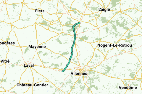du camping La Sittelle à Loué à Sees au camping Le Clos Normand, en montant vers le nord par les routes figurant sur la carte Michelin au 1/200000 ème