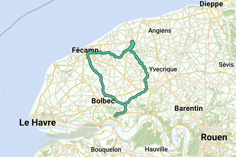 Lillebonne, La Frenaye, Auberville, Grandcamp, Lintot, Lanquetot, Nointot, St Maclou la Brière, Angerville Bailleul, Mentheville, Tourville les Ifs, Fécamp, Vélo route (Fécamp à Cany) Colleville, Valmont, Cany, Grainville la Teinturière, Le Hanouard, à droite D150, à gauche Sommesnil, Héricourt en Caux, D131, à droite route des Tots, Véraval, Bosc Renault, traverser la D6015 par le rd point, Allouville Bellefosse, St aubin de Crétot, Grandcamp, Auberville la Campagne, La Frenaye, Lillebonne.