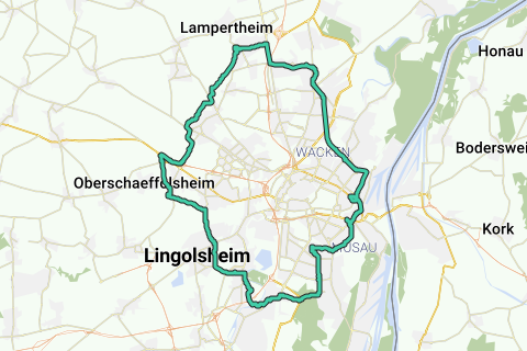 Boucle de 42 km autour de Strasbourg, passage par le canal de la Bruche, route des forts passage par les collines de Mittelhausbergen (vue panoramique sur Strasbourg) passage par le canal de la Marne au Rhin, puis par le parlement européen, le parc de l'orangerie, la coop, le neudorf, stade de la meinau, foret du neuhof et d'Illkirch, passage d'une écluse du canal Rhin-Rhône, Ostwald. Passage par des routes, pistes cyclable et chemins.