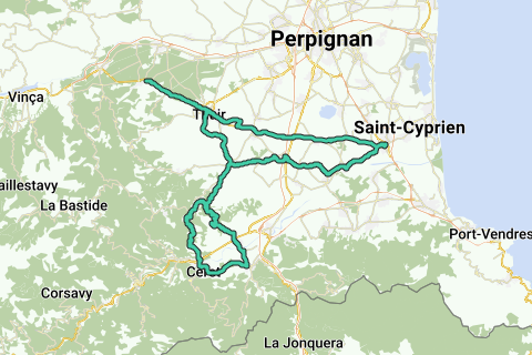 Corbères-les-Cabanes, Cabanes, Thuir, Trouillas, Bages, Elne, Ortaffa, Brouilla, St-Jean-Lasseille, Villemolaque, Fourques, Vivés, St-Jean-Pla-de-Corts, Maureillas, Céret, Col de Llauro, Fourques, Thuir, Corbères-les-Cabanes