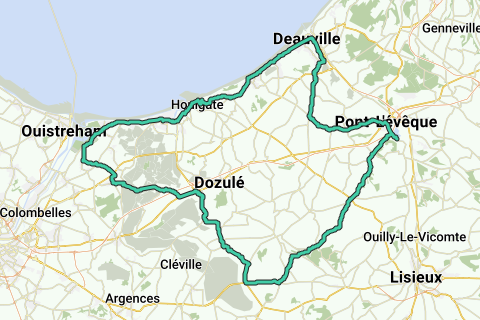 Départ de Pont l'Evêque (Plan d'eau): en sortant du parking à droite puis à gauche D101, St Hymer, La Roque Baignard, Cambremer, D101, à droite D50, St Laurent du Mont, au rond point à droite D16, à gauche D49, Victot-Pontfol, à droite D49, Beuvron en Auge, St Pierre, Plutot en Auge, à gauche les grands jardins, à gauche D675, Goustranville, à droite D224, à droite à gauche Bavent, à droite D236, Amfreville, Sallenelles (Arrêt 53 km boulangerie "Le Sablé Normand" 2 rue André Pierre Marie 02-31-78-73-74), D514, Cabourg, Houlgate, à gauche D163, Auberville, à droite à gauche D513 Villers sur Mer, Blonville sur Mer, Deauville, rond point de la gare à droite D27A, à gauche D27B, St Arnoult, à gauche D278, D275, à gauche D118, Beaumont en Auge, D118 Pont l'Evêque, à gauche à droite D48 vers le le plan d'eau.