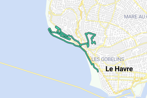 Départ Jardins suspendus, redescente vie le GR sur Le rondpoint "le weekend", remonter par la sente du pain de sucre en passant devant ND des flots, rue de l'hypodrome, redescendre par la table d'orientation, passer devant le Nice Havrais, aller vers le out du monde, revenir le la plage jusqu'à l'OT du Havre