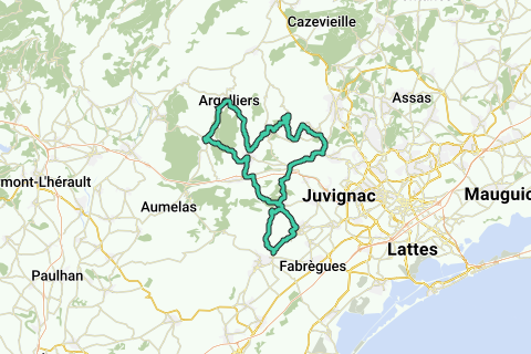 Vailhauquès, Mas de Perri, route de Murles, Combaillaux, Grabels, Bel-Air, Murviel, Pignan, Cournonterral, Murviel, Montarnaud, Croix de Félix, La Boissière, Argelliers, Vailhauquès.