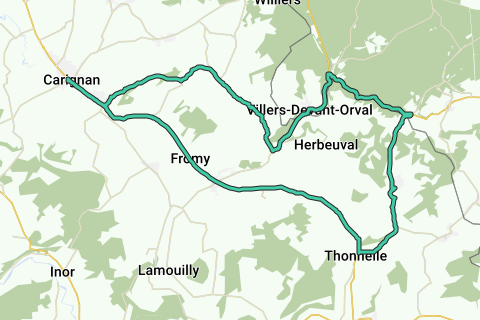 Départ de Carignan, Charbeaux, Orval, Limes, Breux, Thonnelle et retour sur Carignan.