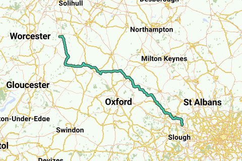 C'est l'itinéraire que j'ai pris en juin 2022, en revenant du festival ABR à Ragley Hall. Gerrards Cross est la fin de la partie la plus agréable de l'itinéraire. Pour la partie restante, j'ai choisi le plus rapide pour traverser Londres, de retour chez moi.
