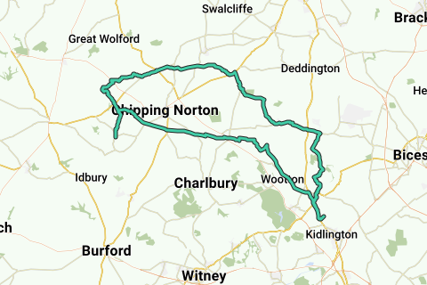 De Kingham à Cornwell, Enstone, Cleveley, Radford, Kiddington, Wooton et Glympton jusqu'à la salle de thé Annies dans le port de bateaux près de Thrupp. Un parcours plus long de retour à travers Tackley, les Bartons, Great Tew, Swerford, Great Rollright, Little Compton et Chasleton jusqu'à Kingham.