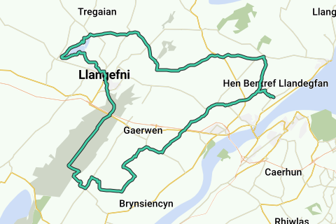Llandegfan, Llansadwrn, Llyn Cefni, Lon Las Cefni, Llangaffo, Star et retour. 33 miles. D'après mon expérience, je recommanderais en fait que cet itinéraire soit effectué dans le sens des aiguilles d'une montre. Cela signifie que vous êtes moins susceptible de lutter contre les vents d'ouest lorsque vous voyagez le long de la section très exposée de Lon Las Cefni. Je lui ai donné un degré de difficulté en raison de l'élément du chemin forestier près de Llyn Cefni. Cela peut être évité, mais cela signifie aller un peu plus loin et devoir utiliser la B5111.