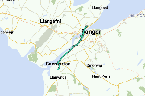 Principalement des chemins tranquilles et la piste cyclable Lon Las Menai, mais une ou deux sections le long de routes assez fréquentées. La fin du parcours utilise une partie de Lon Las Eifion pour atteindre le centre de jardin Fron Goch, où des rafraîchissements peuvent être pris avant, en option, de revenir par le même chemin. 12 miles dans un sens
