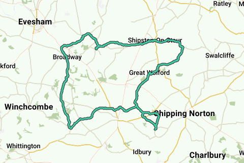 Une agréable balade d'entraînement hivernale (pas trop longue à 56,7 miles), descendant du crêt des Cotswolds dans le Warwickshire, serpentant à travers une campagne pittoresque jusqu'à Chipping Camden et Broadwell avec une montée à Snowshill, entrant dans le Gloucestershire et revenant sur le crêt dans l'Oxfordshire. Également accessible depuis la station de Kingham, à environ 1 mile du point de départ.