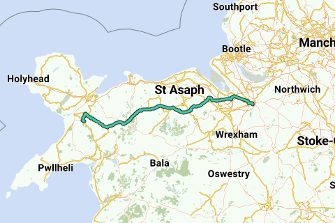 Le trajet lui-même traverse Snowdonia par la vallée principale. Cela offre un paysage impressionnant, presque féérique, dans la première partie de la randonnée. L'ascension dans la vallée principale est tout à fait réalisable (4 km avec une pente moyenne de 6,5 %) et d'une beauté à couper le souffle. Après avoir quitté le parc naturel de Snowdonia, vous entrez dans un terrain très vallonné avec souvent de courtes mais très raides montées pouvant atteindre 25 %. Cette étape peut être qualifiée (par sa longueur et son dénivelé) de l'étape reine de ce voyage à vélo. Arrivée à Chester, une agréable ville fortifiée située au bord de la rivière Dee.