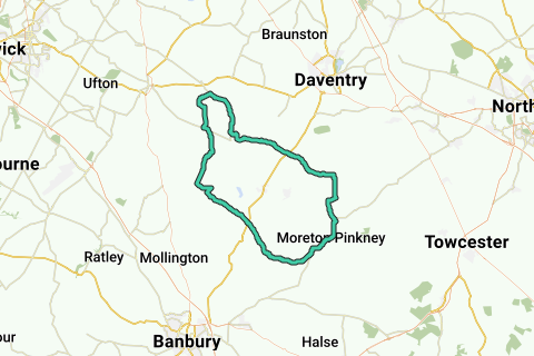 Réchauffez vos muscles et appréciez le paysage à Canons Ashby. Ne vous contentez pas de passer devant cette église (Église de Charwelton), mais arrêtez-vous et admirez cette imposante construction. Il y a peu (aucune) chance que vous croisiez des voitures sur cet itinéraire. De nombreuses montées et descentes le long de ce parcours, mais aussi quelques côtes raides. Profitez des environs. Ne manquez pas de magnifiques paysages. Si je devais résumer cet itinéraire : une belle balade pour un cycliste expérimenté.