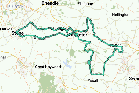 Balade vallonnée de Stone à Uttoxeter, puis le long de la vallée de la Dove, avec une petite diversion jusqu'à Marston Montgomery. Retour vers la maison à Marston-on-Dove, pour gravir un point de passage et traverser la forêt de Needwood, retour à Uttoxeter. Balade sur route B pour revenir à Stone et à sa gare. Café à Tutbury, et Bramshall - plus d'autres proches de l'itinéraire. Le point culminant est la campagne vallonnée, mais prenez le temps de visiter le château de Tutbury. Le lieu de la plus grande explosion jamais survenue à Briaton est juste hors de l'itinéraire près de Hanbury.