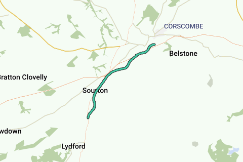 Ancienne ligne de chemin de fer. Tarmac. Pentes douces. Partagé avec les piétons. Parfois fréquenté. Café à la gare. Café/Pub/Boutique de vélo à Sourton (2/3 de la distance)