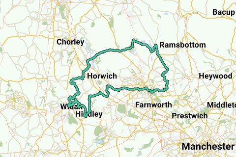 Les collines au nord de Wigan et Bolton forment un agréable contraste avec la grande métropole qui s'étend autour de Manchester. L'oasis de paix qui s'y trouve rend le cyclisme très agréable. Combinez cela avec les routes bien praticables et vous avez une recette parfaite pour une belle journée à vélo.