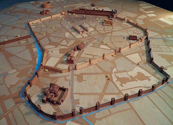 « À Mediolanum, tout est digne d'admiration, il y a de nombreuses maisons de nobles et de grandes richesses. [...] La ville a été élargie et est entourée d'un double anneau de murs. Il y a le cirque, où les gens apprécient les spectacles, le théâtre avec terrasses en forme de coins, temples, le rocher du Palais impérial, la menthe, le quartier qui tire son nom de la Thermae Erculee. Les patios sont des colonnades ornées de statues de marbre, les murs fortifiés sont entourés d'un anneau de remblais. Chacun de ses édifices est plus impressionnant que l'autre et leur ampleur n'est pas attenuée par sa proximité avec Rome. »