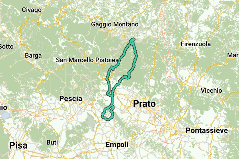 Traverser la Pistoia animée n'est pas un plaisir, fais attention à ne pas te perdre dans les innombrables ruelles, et suis donc la grande rocade (direction Modène) qui est incluse dans cet itinéraire (prends une carte détaillée ou un GPS !). Mais une fois ce point passé, il y a bientôt une bonne montée en direction de la réserve naturelle l'Aquerino (11 km de montée laborieuse !) : le Monte Pozzo !