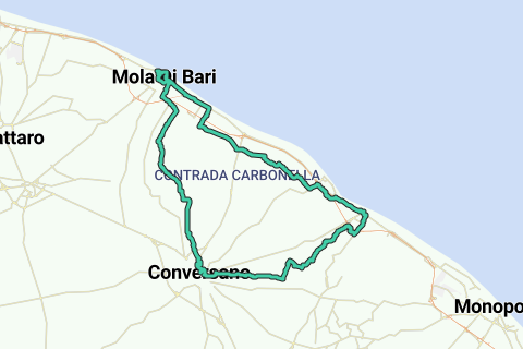 Cette piste cyclable commence le long de la Lungomare Dalmazia à Mola di Bari, une petite ville de la province de Bari. La route continue en direction de Coversano, une ville avec une riche histoire. Enfin, vous pédalez le long des plus belles routes vers Polignano a Mare, l'un des endroits les plus pittoresques le long de la côte des Pouilles avec un magnifique centro storico.