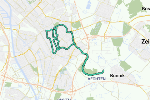 Du Tea House Rhijnauwen, le long du courant, à travers la Minstroom, Nieuwe Gracht, Oude Gracht, Biltse Grift, retour par la Kromme Rijn au Tea House Rhijnauwen.