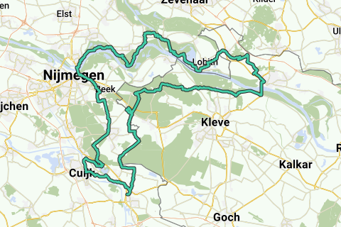 Ensuite, tu suis le cours de la Waal jusqu'à Nimègue, sur le Waaldijk, parfois sur des pistes cyclables séparées. À Nimègue, tu traverses le pont de la Waal en direction de Berg et Dal. Tu montes sur le Poldersveldtweg et descends le Zevenheuvelenweg en direction de Groesbeek et Bisselt. Tu descends la vallée de Zeven et longes Middelaar en direction de la Meuse. Enfin, tu retournes à Gennep, en pédalant le long du petit ruisseau Niers.