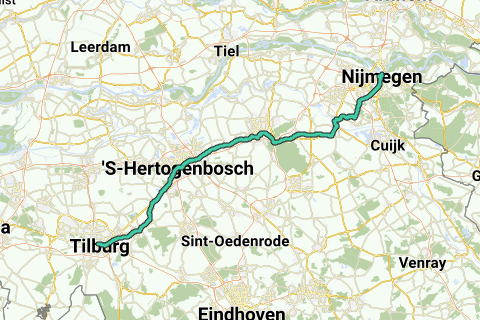 Partie du Marikenpad, la route historique de Nimègue à Anvers. Résumé des étapes 1 à 4 (Nimègue-Tilburg) avec les gares comme points de départ et d'arrivée.