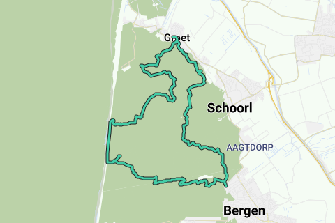 De Duinvermaak à Bergen jusqu'à Groet, le long de la Kerf, du Vogelmeer et de l'accumulation de sable. Retour le long du bord des dunes intérieures et des zones de bruyère, avec des chemins variés. (± 23 km.)