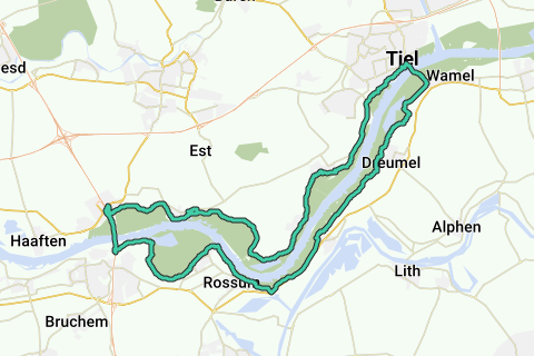 Garez la voiture sur le parking de la Zandstraat à Opijnen. Suivez les chemins de digue le long de la Waal. D'abord le long du côté nord, où cela peut parfois être bondé le week-end. Prenez le ferry à Tiel, voir https://www.rivierenland.nl/voetveer-tiel-wamel. Le côté sud est presque entièrement une piste cyclable autorisée. Traverser le pont Martinus-Nijhoff à vélo est une expérience.