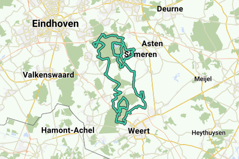D’abord, tu roules le long de Keelven sur des pistes cyclables partiellement non pavées en direction du terrain de golf De Swinkelsche, en passant par le moulin Den Evert et le théâtre naturel De Donck. Ensuite, tu circules principalement sur des routes pavées en direction de Lierop et du hameau de Moorsel. Juste avant le hameau de Moorsel, tu reprends des pistes cyclables non pavées à travers la Strabrechtse Heide et tu passes de nombreux Venns (typiques de cette région). Plus tard, tu circules sur des pistes cyclables à revêtement naturel à travers les forêts de Herbertus. Finalement, tu arrives sur la piste cyclable en béton le long de la route provinciale Heeze - Someren.