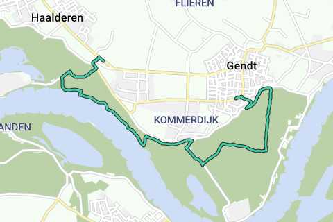 Itinéraire de randonnée de l'arrêt de bus Groenestraat, Haalderen à l'arrêt de bus Markt à Gendt. Les arrêts de bus au début et à la fin se situent tous deux sur la ligne 33, qui va d'Arnhem à Nimègue. L'itinéraire traverse principalement la réserve naturelle.