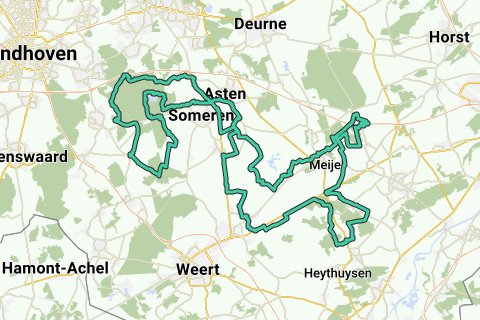 En suivant des routes continues avec une piste cyclable, tu quittes Heusden (près d'Asten) en direction d'Asten et du Zuid-Willemsvaart. Ensuite, tu suis le canal par un chemin en gravier jusqu'à hauteur de Lierop. Après, tu roules sur des chemins goudronnés vers Lierop et le hameau de Moorsel. Juste avant le hameau de Moorsel, tu changes à nouveau pour des pistes cyclables non goudronnées à travers la Strabrechtse Heide et tu passes de nombreux étangs (typiques de cette région). Enfin, tu arrives sur la piste cyclable en béton le long de la route provinciale Heeze - Someren.