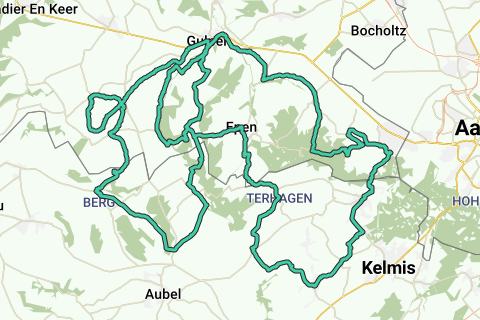 Randonnée Heuvelland 5 depuis Vijlen. Départ/arrivée : boscafé 't Hijgend Hert, Rugweg, Vijlen. Montées : Loorberg Slenaken 1.500 m., max. 8,0 %. Dorpsstraat/Kultjen Remersdael (B) 2.400 m., max. 7,0 %. Kwinten/Op de Eiken St. Martens-Voeren (B) 1.800 m., max. 8,0 %. Kütersteenweg Noorbeek 1.200 m., max. 5,0 %. Molenweg Banholt 750 m., max. 7,0 %. Koning van Spanje Gulpen 1.700 m., max. 10,0 %. Smidsberg Epen 1.500 m., max. 7,0 %. Rue de Sippenaken Sippenaeken/Hombourgh (B) 2.600 m., max. 8,0 %. Rue de Vaals Gemmenich (B) 1.100 m., max. 9,0 %. Camerig-oost Vaals 2.800 m., max. 12,0 %. Dénivelé 1.134. Pause café : Gasthof Euverem, Euverem 30, Gulpen (ouvert tous les jours).