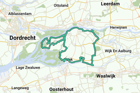 À Biesbosch Museumeiland, tu arrives sur la piste cyclable le long de la route principale. Ensuite, tu reviens à travers des routes calmes dans le Noordwaardpolder, maintenant le long du ruisseau Boomgat et sur le Kroonbrug (un ancien pont levant). Après cela, tu roules sur des routes sans voitures le long de la Merwede. Tu arrives à nouveau à Werkendam, puis tu passes par des routes sinueuses le long de la Merwede et ensuite à travers la vieille ville fortifiée de Woudrichem. Ensuite, tu passes par des routes dikes le long de la Meuse endiguée. À Giessen, tu traverses le polder et longes l'ancien fort Giessen, la réserve naturelle d'Andels Broek et le château de Meeuwen. Enfin, tu arrives à la Bergse Maas, que tu suis par la piste cyclable goudronnée au-dessus du dike (tu dois cependant surmonter 75 mètres de pavés pour accéder à la piste cyclable). Sur une partie de cette piste cyclable, le bétail peut paître librement, donc tu peux rouler juste à côté des vaches (et tu dois t'attendre à des crottes de vache sur le chemin !). Puis tu quittes le dike à Dussen pour retourner au château de Dussen.