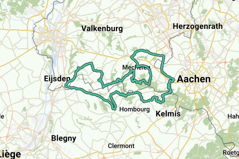 Randonnée Heuvelland 63 depuis Vijlen. Départ/arrivée : boscafé 't Hijgend Hert, Rugweg, Vijlen. Montées : Dal Bissen/Schweiberg Mechelen 2.700 m., max. 9,0 %. Schilberg Slenaken 1.200 m., max. 12,0 %. Kütersteenweg Noorbeek 1.200 m., max. 5,0 %. Magnebos Veurs (B) 2.200 m., max. 9,0 %. Kasteelstraat Teuven (B) 1.200 m., max. 10,0 %. Rue les Trois Bornes Gemmenich (B) 2.200 m., max. 6,0 %. Lemiersberg Lemiers (D) 900 m., max. 12,0 %. Plettenberg est Eys 800 m., max. 8,0 %. Hilleshagerweg/ Vijlenberg/Rugweg Mechelen/Vijlen 5.200 m., max. 8,0 %. Mètres d'altitude : 1.278. Arrêt café : brasserie Het Rode Bos, Varnstraat 17, Remersdaal (B) (ouvert du mercredi au dimanche).