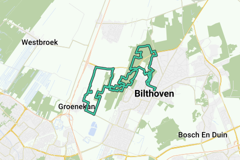 NS Bilthoven via les Leijen vers Beukenburg. Vers la forêt Voordaan et retour par Beukenburg vers les Leijen. Les forêts de Ridderoord et retour par le parc de la lande vers NS Bilthoven