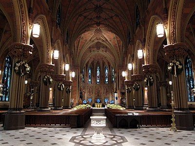 La cathédrale de style néogothique est construite entre 1848 et 1852 par Patrick Keely et consacrée en 1852 par Mgr John Hughes , archevêque de New York. Son premier évêque, Mgr John McCloskey , était évêque coadjuteur de New York avec droits de succession et s'installa donc à New York en 1865, après la mort de Mgr Hughes, laissant le siège vacant pendant de longs mois. L'intérieur de l'église est recouvert de plâtre et de lattes et peint en trompe-l'œil pour donner l'impression de pierres.